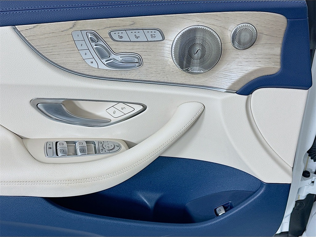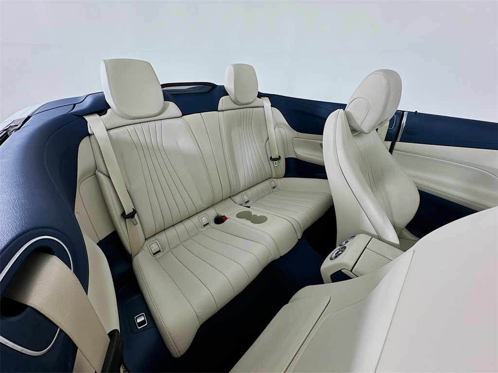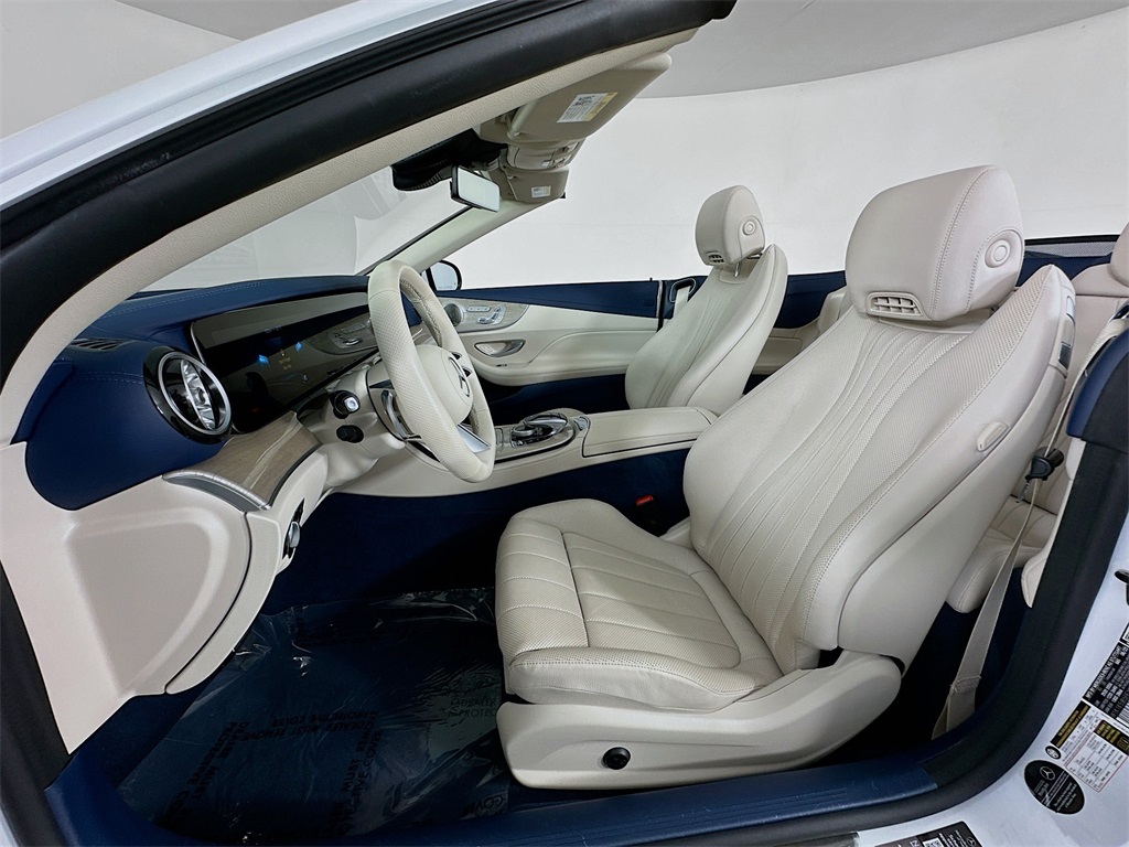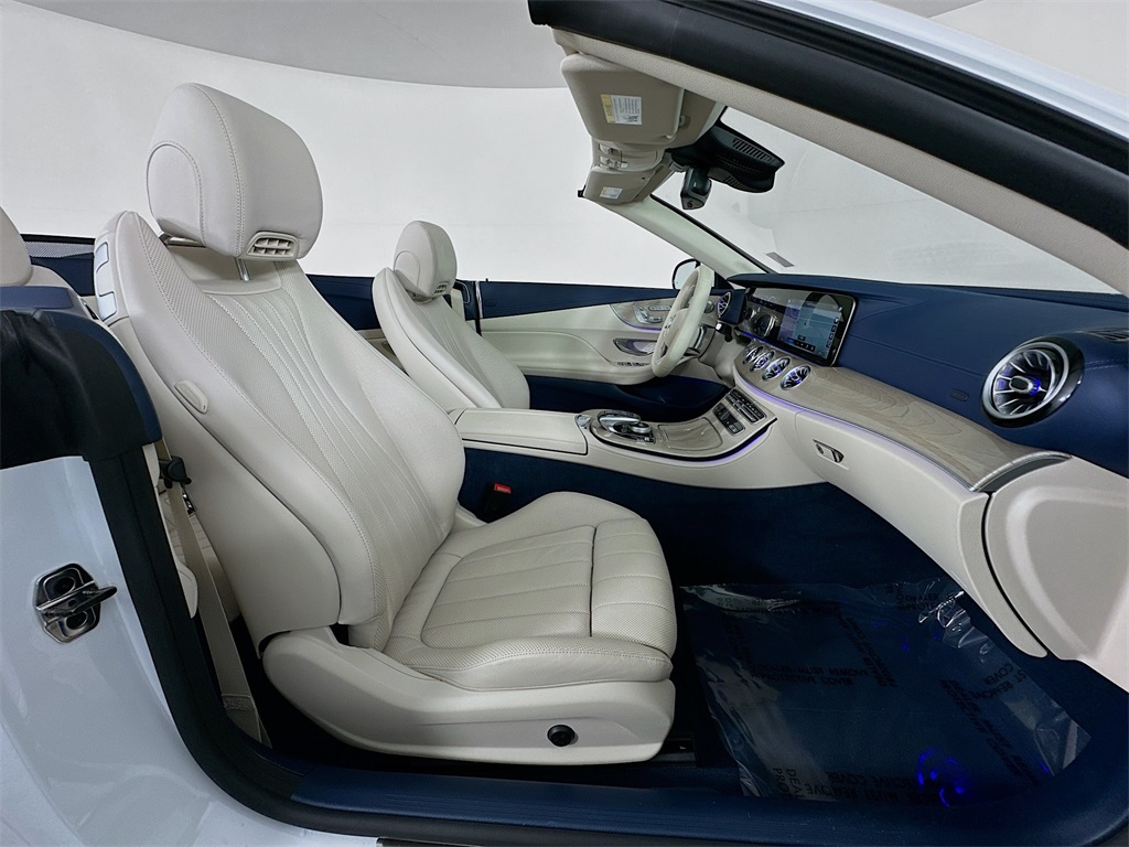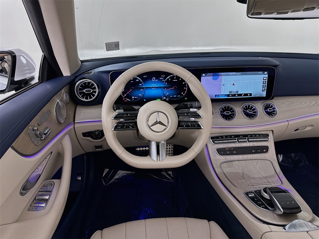 - 2023 E 450CABRIOLET IN THE HIGHLY DESIRABLE COLOR COMBINATION OF MANUFAKTUR MOONLIGHT WHITE METALLIC WITH MACCHIATO BEIGE / YACHT BLUE LEATHER WITH BLUE TOP AND LIGHT BROWN SEN WOOD INTERIOR.